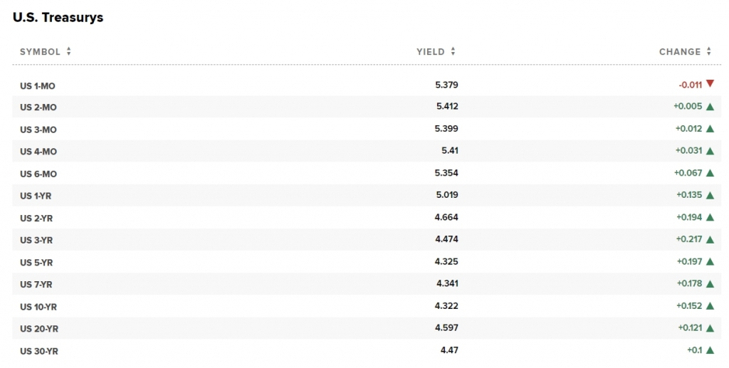 국채수익률은 급등했다. 10년 만기 재무부 채권은 전거래일보다 14bp 이상 상승(가격하락)한 4.314%를 기록했다. 20년물은 4.59%, 30년물은 4.46%대로 치솟았다. 단기물인 2년물 금리도 18bp나 급등한 4.654%를 나타냈다.