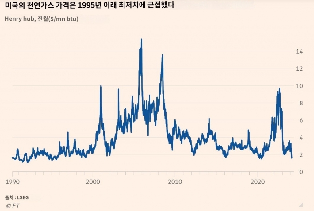 미국 천연가스 가격이 30년 만에 최저 수준으로 곤두박질쳤다. 1950년대 공식 측정 이후 가장 따뜻한 겨울 날씨에 공급 과잉이 겹치면서다.