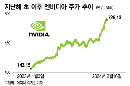 엔비디아는 창립 30주년을 맞은지 얼마 지나지 않은 8개월 전에 반도체회사로는 처음으로 시가총액이 1조달러를 넘어섰다. 현재는 시총이 1조8000억달러에 조금 못 미치는 수준까지 급증해 아마존과 알파벳을 뛰어넘어 미국에서 기업 가치가 3번째로 높은 기업이 됐다.
