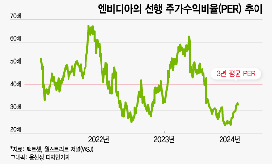 팩트셋에 따르면 엔비디아의 향후 12개월 주당순이익(EPS) 전망치 기준 선행 주가수익비율(PER)은 38배로 엔비디아의 2021년 이후 3년 평균 PER 대비 9%가량 낮은 수준이다.