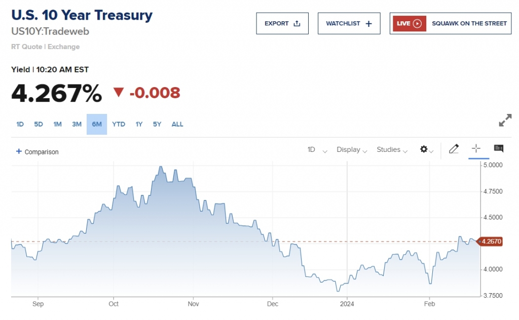 실제로 지난해 10월 중순 이후 5%를 웃돌던 미국 10년물 국채금리는 연준이 올해 금리를 3차례 인하할 것이라고 12월초 발표하자 연말에 3.7%대까지 급전직하(가격은 반대로 상승)했다. 하지만 금리인하 기대에 들떴던 시장은 연초부터는 잇따른 예상 밖 경제지표의 등장으로 금리재상승을 목도하고 있다. 10년물 국채금리는 두달도 안 되는 기간에 최근 4.3%대까지 꾸준히 상승했다.