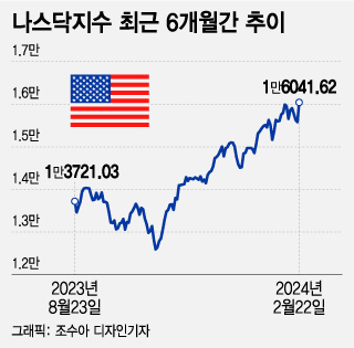 하지만 미국 증시는 22일 엔비디아의 몬스터급 어닝 서프라이즈에 AI(인공지능) 수혜주를 중심으로 급반등하면서 조정 기대감을 무색하게 만들었다. 이날 다우존스지수는 1.2%, S&P500지수는 2.1%, 나스닥지수는 3.0% 뛰어올랐다.