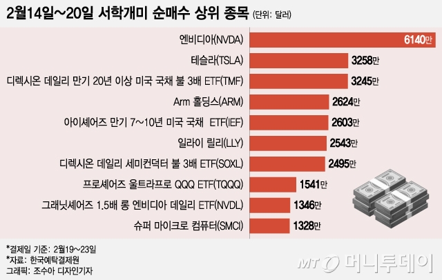 서학개미들이 이 기간 동안 가장 많이 순매수한 종목은 엔비디아로 6140만달러의 매수 우위를 나타냈다. 지난 21일 장 마감 후 실적 발표를 앞두고 주가가 하락하자 과감히 실적 강세에 베팅한 것으로 보인다. 엔비디아는 시장 기대를 크게 뛰어넘는 실적을 발표하며 주가가 22일 하루에 16% 급등했다.