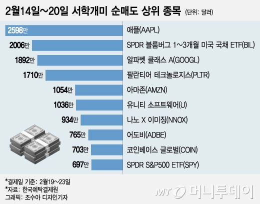 반면 같은 AI 수혜주인데도 팔란티어 테크놀로지스는 차익 실현이 계속됐고 애플에 대한 서학개미들의 매도도 이어졌다.
