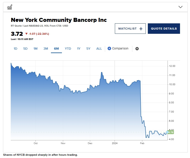 뉴욕커뮤니티은행(NYCB)이 부동산 투자손실에 따른 원인으로 내부통제 문제를 공개한 이후 개장일에 26.41% 급락했다. 이날 NYCB는 전일 발표를 통해 알레산드로 디넬로 집행위원장이 즉시 사장 겸 CEO(최고경영자) 역할을 맡게 된다고 발표했다 . NYCB는 부분적으로 상업용 부동산 노출에 대한 우려로 인해 최근 몇 달 동안 주가가 급락했다.
