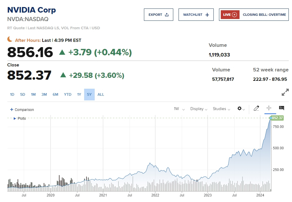 지수는 소강상태를 보였지만 AI(인공지능) 랠리의 대장주인 엔비디아는 이날도 3.61%나 상승하면서 주당 852.52달러를 기록했다. 이날 장중 최고치는 875달러를 넘어서기도 했다. AI 랠리의 한편에 선 슈퍼마이크로컴퓨터는 이날 18% 이상 치솟으면서 주가가 주당 1074달러를 돌파했다. 이달 말에 이 주식이 S&P 500에 편입된다는 소식에 투자자들이 급히 몰려들었다.
