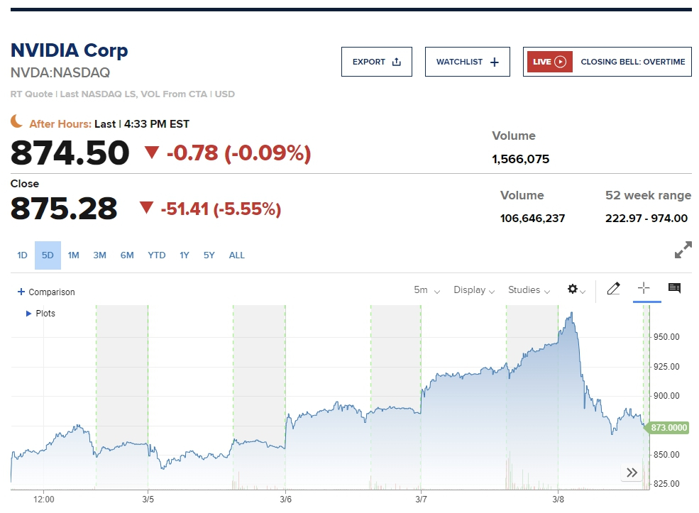 엔비디아는 이날 주당 1000달러 고지 직전에 추락하기 시작해 875달러까지 하루 사이에 주가가 상하방 10% 이상의 범위에서 롤러코스터를 탔다. AXS인베스트먼트의 그렉 바숙은 "이제 엔비디아 투자에서 이익을 실현할 때"라며 "장기적인 AI 성장 잠재력에도 불구하고 주가가 단기간에 너무 급등했다"고 지적했다.