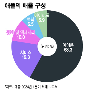 애플의 돈줄인 아이폰 판매량도 꺾이는 추세다. 지난해 9월 출시된 최신작 아이폰15 시리즈의 첫 4개월 판매량은 아이폰14 대비 200만대 줄었다. 특히 애플 전체 매출의 20%를 차지하는 중국에서 부진이 두드러졌다. 글로벌 시장조사기관인 카운터포인트리서치에 따르면 올 들어 첫 6주간 중국 내 아이폰 판매량은 지난해 같은 기간보다 24% 감소했다. 중국 내 애플 점유율은 15.7%로 종전 2위에서 4위로 주저 앉았다.