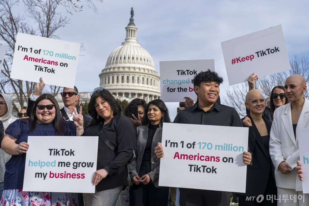 ![[워싱턴=AP/뉴시스] 13일(현지시각) 미 워싱턴 국회의사당 주변에서 소셜미디어 틱톡 애호가들이 지나가는 운전자들을 향해 틱톡 지지 팻말을 보여주고 있다. 미국인 1억7천만 명이 이용하는 틱톡의 미국 내 유통을 금지한다는 법안이 미 하원에서 통과돼 많은 틱톡 애호가가 반발하고 있다. 미 하원은 틱톡 모기업인 '바이트댄스'가 중국 기업이라 미국의 안보가 우려된다는 게 이유로 틱톡 금지 법안을 승인했다. 2024.03.14. /사진=민경찬](https://thumb.mt.co.kr/cdn-cgi/image/f=avif/21/2024/03/2024031514045554025_1.jpg)