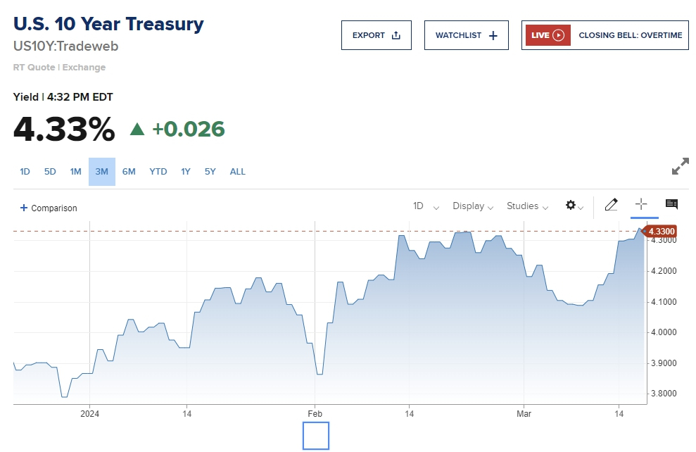 이날 채권시장 수익률은 대체로 상승세(가격하락)를 보였다. 벤치마크 10년물 미국 국채 금리는 전 거래일보다 2.6bp 오른 4.33%를 기록했다. 단기물인 2년물 금리도 1.1bp 상승한 4.734%를 나타내고 있다.