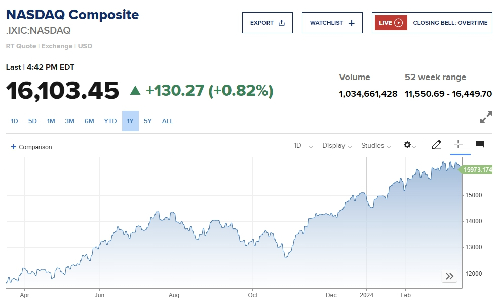 18일(현지시간) 뉴욕증시에서 다우존스 지수는 전거래일보다 75.66(0.2%) 오른 38,790.43을 기록했다. S&P 500 지수도 32.33포인트(0.63%) 상승한 5,149.42에 거래를 마쳤다. 나스닥은 130.27포인트(0.82%) 올라 지수는 16,103.45에 마감했다.