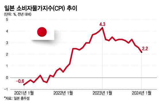 길고 긴 디플레이션 터널에 빛이 보이기 시작한 건 지난해부터다. 지난해 일본 소비자물가는 1년 전보다 3.2% 올라 1982년(2.8%) 이후 최고치를 기록했다. 지난해 11월부터 올 1월까지는 3개월 연속 2%대 물가 상승률을 지속하고 있다. 일본은행이 마이너스 금리 해제 우선 조건으로 제시해 온 '2%대 물가 상승률'을 충족한 셈이다.