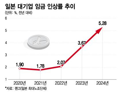 일본 최대 노동조합 단체인 렌고에 따르면 올해 일본 기업(직원 1000명 이상) 평균 임금 인상률은 5.28%로 집계됐다. 이는 1991년(5.66%) 이후 33년 만에 가장 높은 증가율로 물가 상승률을 충분히 상쇄하는 수준이다. 지난해 일본 기업 임금 인상률은 평균 3.6%였지만 고물가로 실질 임금은 계속 감소했다.
