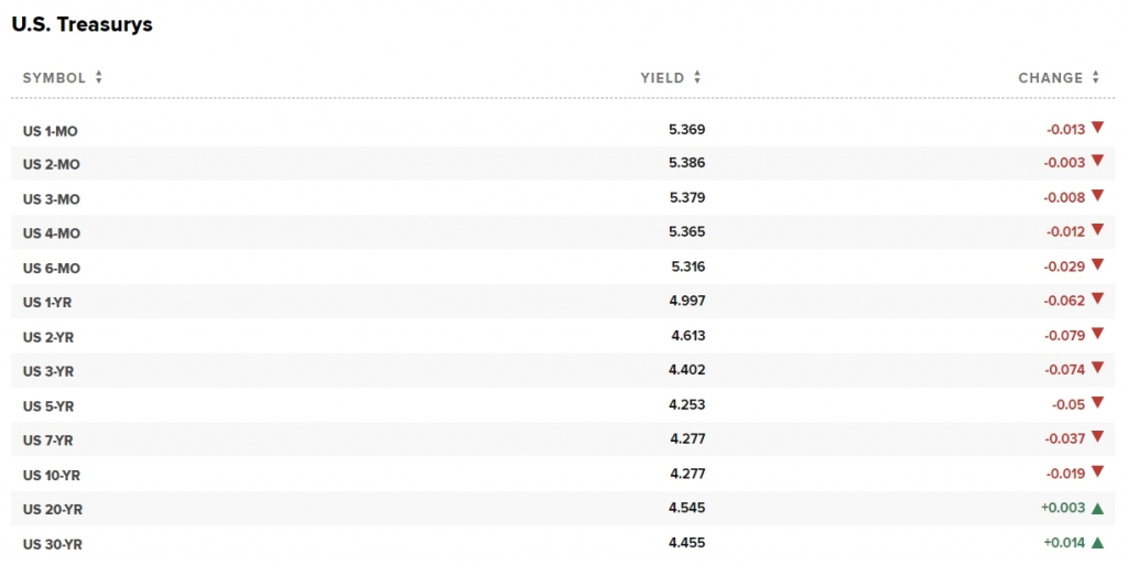 이날 채권시장에선 벤치마크 10년물 미국국채 금리가 전 거래일보다 2bp 가량 내린 4.277%를 기록했다. 단기물인 2년물 금리는 8bp나 급락한 4.613% 수준을 나타냈다.
