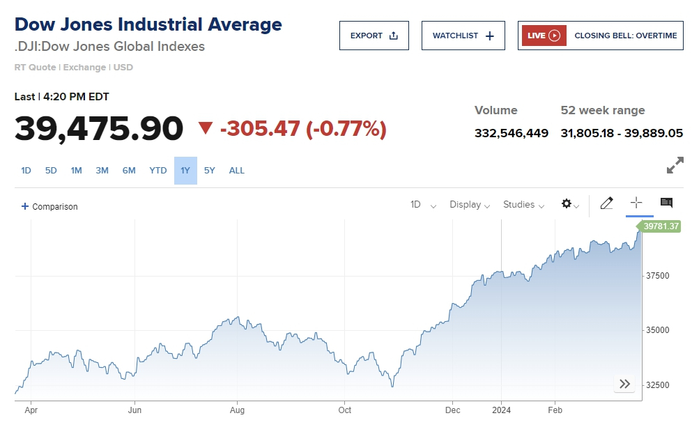 뉴욕증시가 나흘 랠리의 피로를 내비치며 이번주 마지막 거래일을 혼조세로 마무리했다. 전일 전인미답의 40,000포인트 선에 다가갔던 다우존스 지수는 이날 내리막길을 타고 전거래일 대비 250포인트 이상 하락했다.