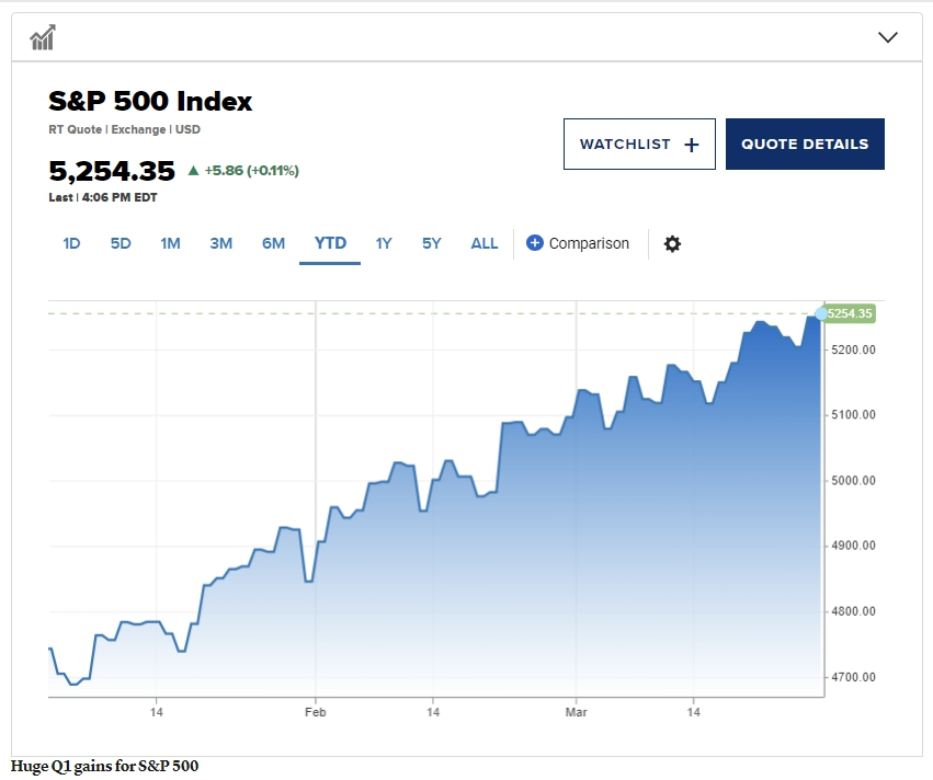 S&P의 상승을 주도한 것은 뭐니뭐니해도 AI(인공지능) 랠리 대장주인 엔비디아다. 엔비디아 주가는 1분기 동안 83%, 3월에만 15% 상승했다. 월간 S&P 500 지수 상승률은 3.2%에 달했고 나스닥과 다우 지수도 각각 2%, 2.2% 올랐다.