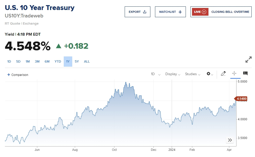 물가가 잡히지 않고 금리인하가 미뤄질 거란 예상에 국채시장 금리는 치솟고 있다. 이날 10년 만기 미국 국채금리는 전 거래일 대비 13.5bp 급등해 연율 4.5%를 넘어섰다. 장기채 금리가 5%를 넘나들던 지난해 같은 분위기가 재현됐다는 지적이다.
