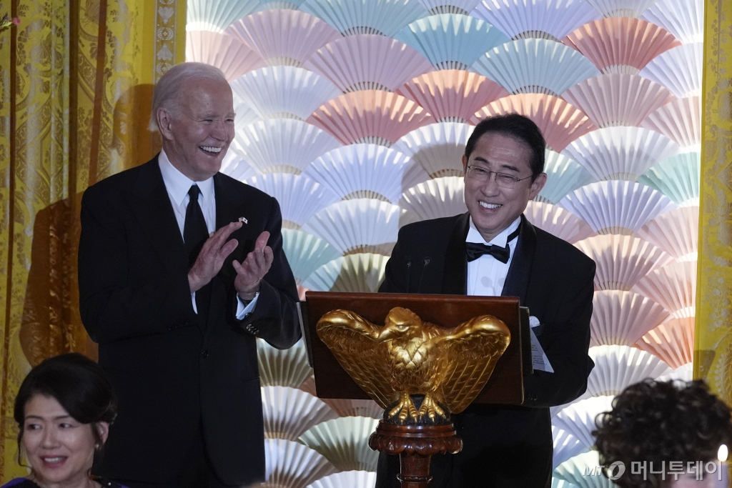 ![[워싱턴=AP/뉴시스] 조 바이든(왼쪽) 미국 대통령이 10일(현지시각) 백악관에서 열린 국빈 환영 만찬 중 기시다 후미오 일본 총리의 연설을 들으며 박수하고 있다. 2024.04.11. /사진=민경찬](https://thumb.mt.co.kr/cdn-cgi/image/f=avif/21/2024/04/2024041705191849974_1.jpg)