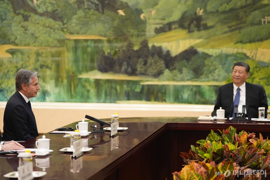 ![[베이징=AP/뉴시스]중국을 방문한 토니 블링켄 미 국무장관(왼쪽)이 26일 중국 베이징 인민대회당에서 시진핑(習近平) 중국 국가주석과 회담하고 있다. 시진핑 주석은 블링컨 장관에게 주석은 "중국과 미국은 경쟁자가 아니라 파트너가 돼야 한다"고 블링컨 장관에게 말했다. 2024.04.26. /사진=유세진](https://thumb.mt.co.kr/cdn-cgi/image/f=avif/21/2024/04/2024042622033718036_1.jpg)