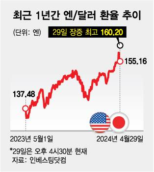 최근 시장에서 일본 금융당국의 개입 가능성을 점치는 이유도 여기에 있다. 160엔 저항선이 뚫린 상황이어서 언제 일본 정부의 시장 개입이 이뤄져도 이상하지 않다는 해석이 쏟아진다.