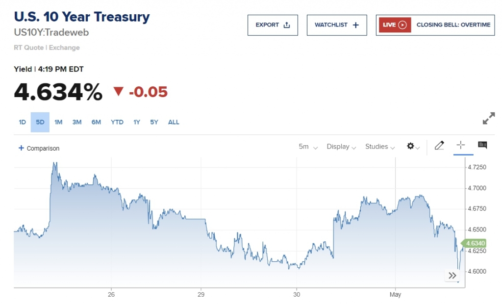 뉴욕증시가 중앙은행장의 금리인상 가능성 배제 발언에 힘입어 장중 상승 반전했지만 막판 기술주 중심의 나스닥과 S&P 500 지수는 하락세를 면치 못했다. 연방준비제도(Fed)는 5월 기준금리를 3월과 동일한 5.25~5.50%로 동결했는데 제롬 파월 연준 이사회 의장은 6월 금리인상 가능성은 거의 없다고 밝혔다.