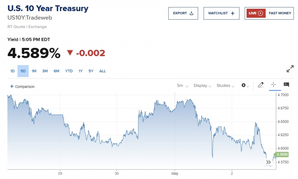 최근 금리가 4.7%대까지 올랐던 10년물 미국국채는 전일에 이어 이날 4.589%까지 떨어졌다. 5%가 넘었던 단기물 2년물 국채도 이날 4.881%를 기록했다. CME 그룹이 측정한 최근 선물 시장 가격에 따르면 트레이더들은 적어도 9월까지는 금리 인하를 기대하지 않고 있다. 그러나 채권 수익률에 선반영됐던 금리인상 재개에 대한 리스크는 연이틀 하락으로 많이 제거된 것으로 풀이된다.