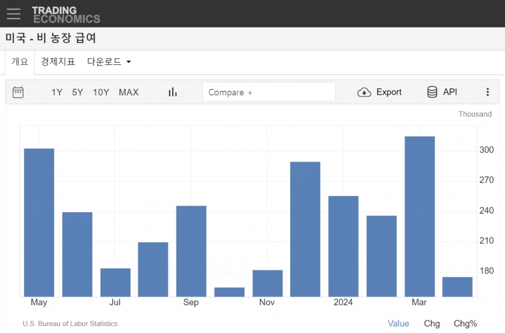 미국 4월 비농업 고용이 17만 5000개 증가해 다우존스 컨센서스인 24만개보다 현저히 낮은 것으로 나타났다. 미국도 차츰 고용시장이 움츠러들고 있다는 지적이 나온다. 다만 그 속도가 예상 가능한 수준이고 중앙은행이 이로 인해 금리인하 시기를 더 이상 연장하지 못할 구실이 될 수 있다는 해석도 가능하다.