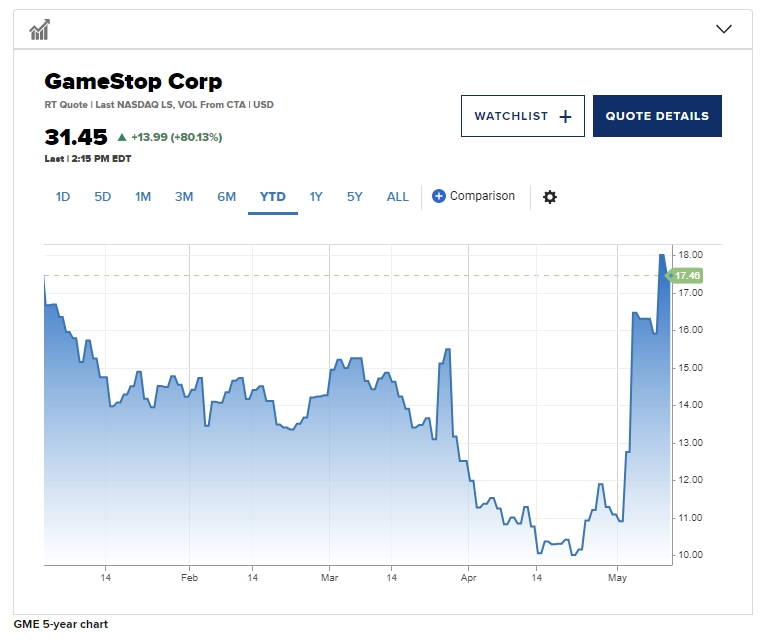 하지만 게임스톱 주가는 다시 상승하기 시작했는데 올해만 57% 급등해 지난 금요일에 주당 17.46달러에 거래를 마감했다. 이날 주가는 하루 만에 13달러 가량 올라 상승률이 74.4%(주당 30.45달러)에 달했다. 게임스톱의 급등과 함께 왕년의 밈 주식인 AMC 주식도 이날 78.35% 폭등했다. 시장 관계자들은 증시에 금리 이슈 이외에 다른 변수가 나타나지 않자 무료해진 개인투자자들이 밈주 열풍을 다시 시작하는 것이라는 분석을 내놓고 있다.