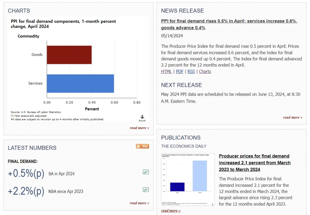 미국의 도매물가가 전월비 0.5% 상승했다. 예상보다 높은 물가상승세가 계속되고 있다는 지적이 나온다. 이날 미국 노동부는 4월 생산자물가지수(PPI)가 전월비 0.5%, 전년비 2.2% 상승했다고 밝혔다. 다우존스 전문가 예상치는 0.3%였는데 이를 훌쩍 뛰어넘은 셈이다. 하지만 노동부는 지난 3월 수치가 전월비 0.2% 상승이 아니라 0.1% 하락이라고 수정했다.