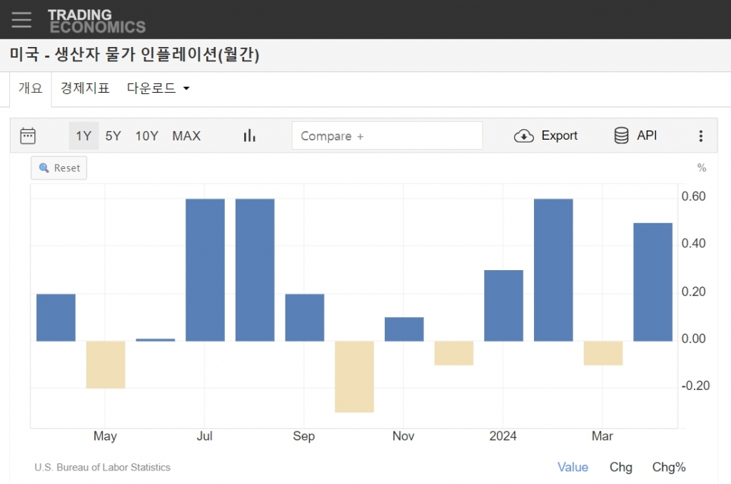 변동성이 높은 식품과 에너지를 제외한 근원 PPI는 0.5% 상승해 예상치 0.2%의 두 배 이상을 기록했다. 근원 PPI에서 다시 무역 서비스를 제외한 지표의 전월비 상승률은 0.4%, 전년비는 3.1%를 나타내 지난해 4월 이후 최고치를 찍었다.