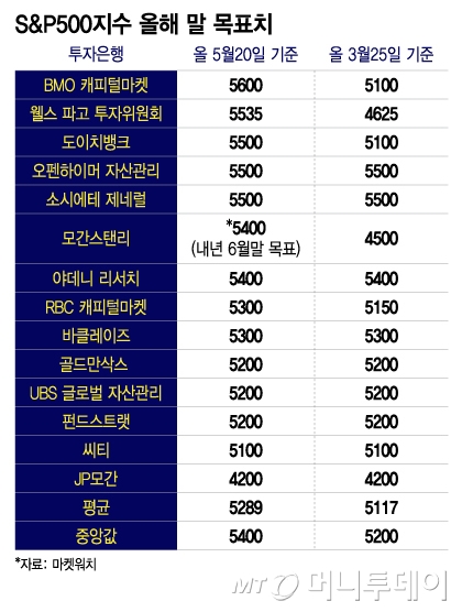 마켓워치가 조사한 결과 최소 11개 투자은행 및 투자 리서치회사가 올들어 S&P500지수의 연말 목표치를 올렸다. 지난 주말에는 BMO 캐피털마켓과 도이치뱅크가 S&P500지수의 올해 말 목표치를 각각 5600과 5500으로 상향 조정했다.
