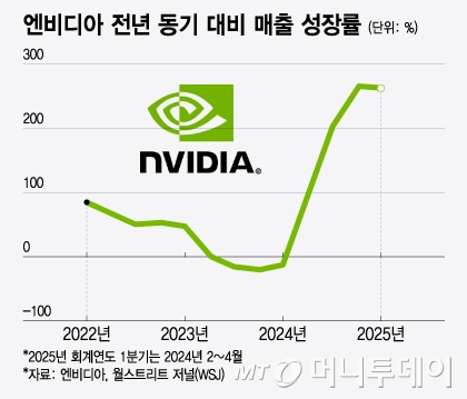 엔비디아는 22일(현지시간) 장 마감 후 회계연도 2025년 1분기(올 2~4월)에 260억4000만달러의 매출액을 올렸다고 밝혔다. 이는 전년 동기 대비 262% 늘어난 것으로 팩트셋이 조사한 애널리스트들의 전망치 246억달러를 웃도는 것이다.