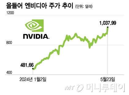 엔비디아 주가가 23일(현지시간) 호실적과 주식 10 대 1 분할 발표에 1000달러를 넘어 사상최고치를 경신했다.