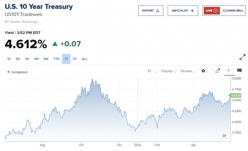 주가 하락은 국채시장의 수익률 상승에 대한 결과로도 풀이된다. 이날 10년물 미국 국채금리는 전 거래일보다 7bp 이상 상승한 4.612%를 기록했다. 20년물과 30년물 모두 7bp 이상 올랐고, 단기물인 2년물 금리는 약 2bp 상승한 4.975%를 기록했다. 전일 재무부의 채권 발행물이 경매에서 수요부진을 맞닥뜨리면서 수익률은 다시 상승세(가격은 하락)로 이어져 투자자들에 부담이 되고 있다.
