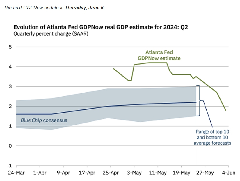 이날 제조업 지수 부진에 미국의 2분기 경제성장률 예측치는 하향됐다. 애틀랜타 연방준비제도이사회(FRB)가 추적하고 있는 2분기 GDP(국내총생산) 추적기는 이를 반영해 2.7%에서 1.8%로 크게 하락했다.