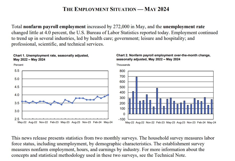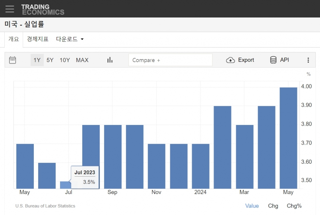 5월 일자리는 늘었지만 실업률은 전월에 비해 0.1%p 증가한 4.0%를 기록해 지난 2022년 1월 이후 최고치를 기록했다. 실업률은 최근 반기 사이에 지난 2월 3.9%를 기록했다가 다시 익월에 3.8%로 떨어졌고, 지난달에 3.9%로 소폭 상승하더니 5월에 4%대로 진입했다. 같은 시기 실업자수는 660만명으로 전년 동월 실업률은 3.7%였고 실업자수는 610만명이었다.