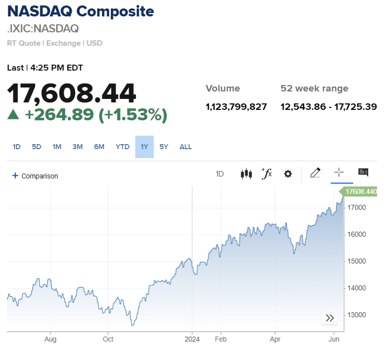 뉴욕증시에서 나스닥 지수가 5월 소비자 물가지수(CPI)의 완화로 크게 상승했다. 기술주 위주인 나스닥과 S&P 500 지수는 1% 안팎 상승하면서 둘 다 사상 최고치를 경신했다. 다만 전통적 대형주 30개 집합인 다우존스 지수는 약보합세에 머물렀다.