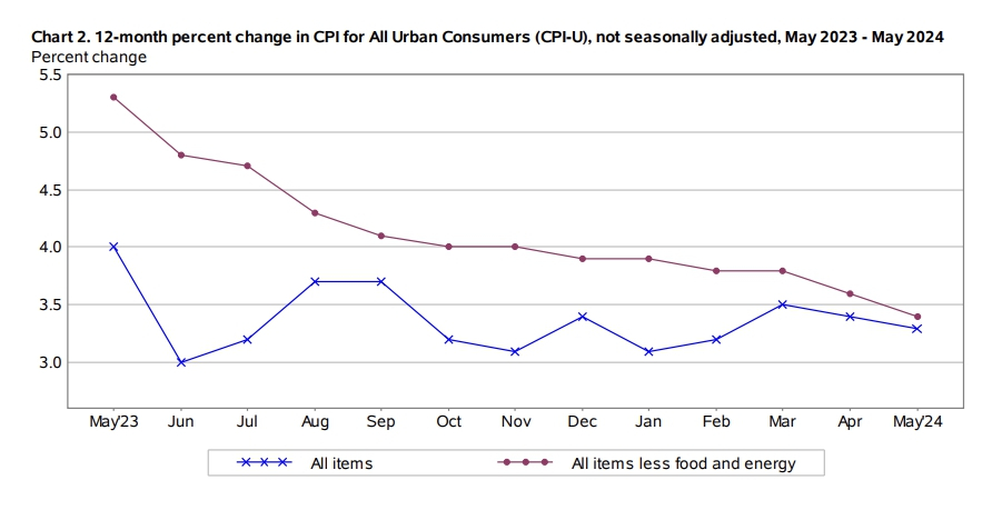 이날 5월 소비자 물가지수(CPI)는 전년비 3.3% 상승해 예상치보다 0.1%p 낮은 수준을 기록했다. 1분기 내내 경제를 압박해왔던 물가상승 압력이 다시 낮아지기 시작한 것으로 풀이되는 결과였다. 미국 중앙은행인 연방준비제도(Fed)는 이날 물가 상승률이 다시 완화되기 시작했다며 기준금리를 동결했다.