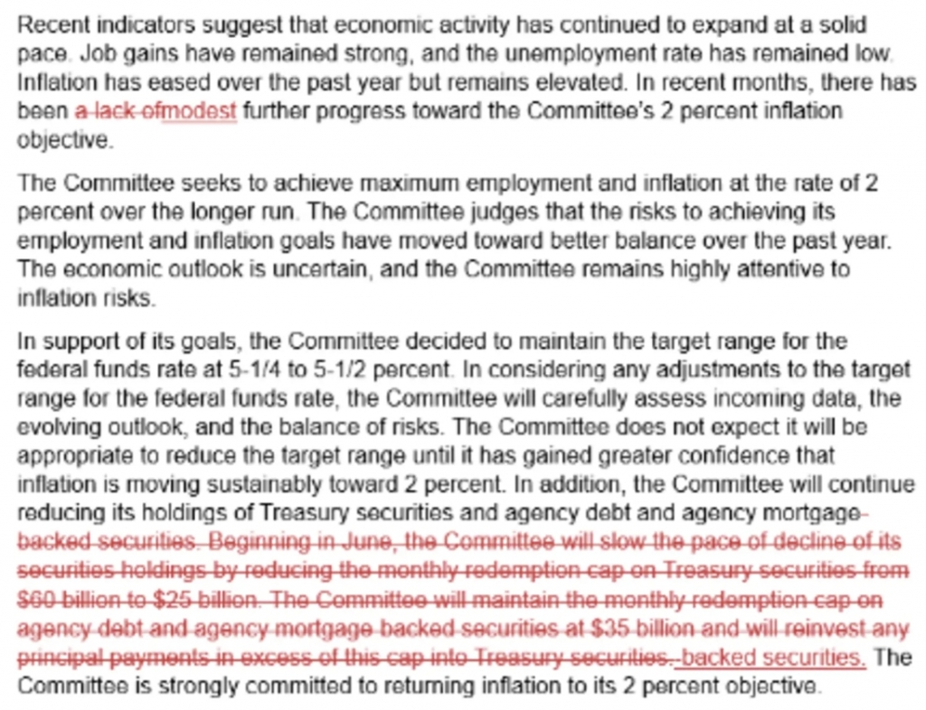 연준은 기준금리 발표 성명서에서 "인플레이션은 지난 1년 동안 완화되었지만 여전히 상승세를 유지하고 있다"고 지적했지만 "최근 몇 달 동안 연준의 2% 인플레이션 목표를 향한 약간의 추가 진전이 있었다"고 기술했다. 기대만큼 빠르지는 않지만 그럼에도 불구하고 물가 상승률 감소의 진전이 더디게 진행되고 있다는 설명이다. 지난달 성명서에서는 물가 상승률 감소에 대해 "더 이상의 진전이 이뤄지지 않고 있다"고 표현했다.