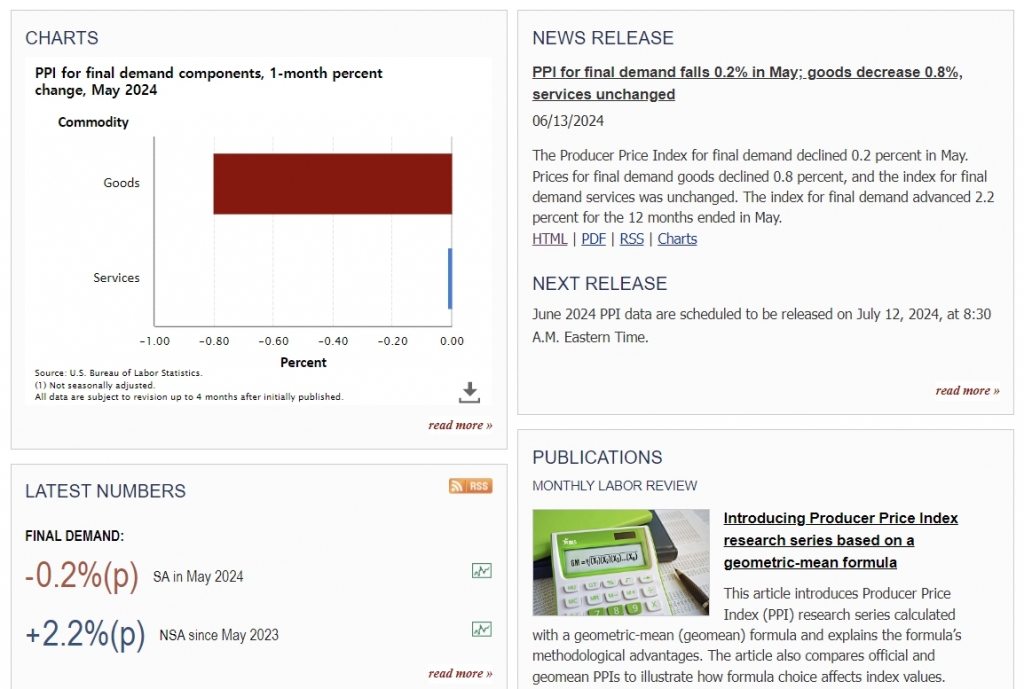 이날 노동부 통계국은 지난 5월 생산자물가지수(PPI)가 전월비 0.2% 하락했고, 전년비로는 2.2% 상승했다고 밝혔다. 5월 PPI에 대한 전문가 예상치는 전월비 0.1% 상승, 전년비 2.5% 상승이었는데 각각 0.3%p씩 예상치를 하회한 셈이다.