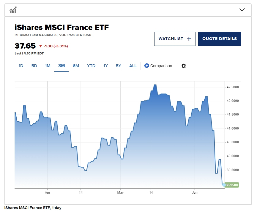 이날 파이낸셜타임즈(FT) 등에 따르면 파리증시의 캑 콰란테(Cac 40) 지수는 임시총선이 결정된 이후 5 거래일 기간동안 6% 이상 급락했다. 뉴욕증시에 상장된 프랑스 관련 ETF인 iShares MSCI France ETF(EWQ)는 2년여만에 최악의 한 주를 겪었다. EWQ의 주가는 이번 주에 9% 이상 하락해 펀드가 2022년 3월 4일(-12.9%) 이후 최악의 주를 기록했다. 이날도 3.31% 떨어졌다.