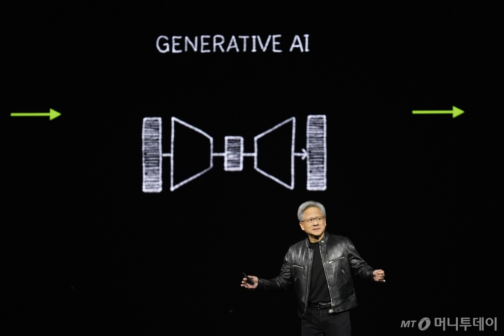 ![[새너제이=AP/뉴시스] 젠슨 황 엔비디아(NVIDIA) CEO가 18일(현지시각) 미 캘리포니아 새너제이에서 개막한 엔비디아 개발자 콘퍼런스 '엔비디아 GTC'에 참석해 기조연설하고 있다. 2024.03.19. /사진=민경찬](https://thumb.mt.co.kr/cdn-cgi/image/f=avif/21/2024/06/2024062205421582071_1.jpg)