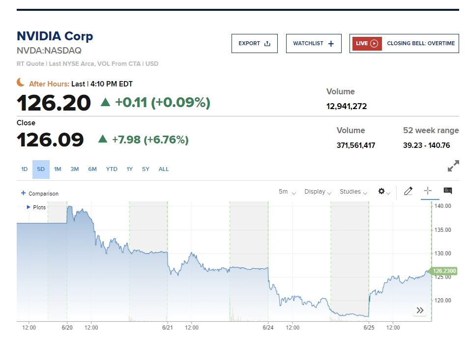 뉴욕증시에서 엔비디아가 전일 하락폭 만큼 상승하면서 나스닥과 S&P 500 지수의 반등에 큰 영향을 미쳤다. 세계에서 가장 큰 주식시장을 한 종목의 등락이 좌우하는 시간이 길어지고 있다. 엔비디아를 추종하는 서학개미(한국의 해외주식 투자자) 군단은 올해만 엔비디아에 14억 4600만 달러 이상을 순매수한 것으로 집계됐다.