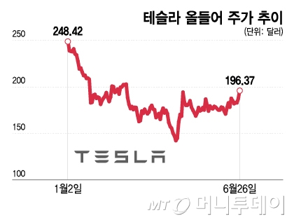 테슬라 주가는 지난 3월1일 202.64달러에서 다음 거래일인 3월4일에 188.14달러로 급락한 뒤 4개월 가까이 200달러는 물론 190달러도 회복하지 못했다.