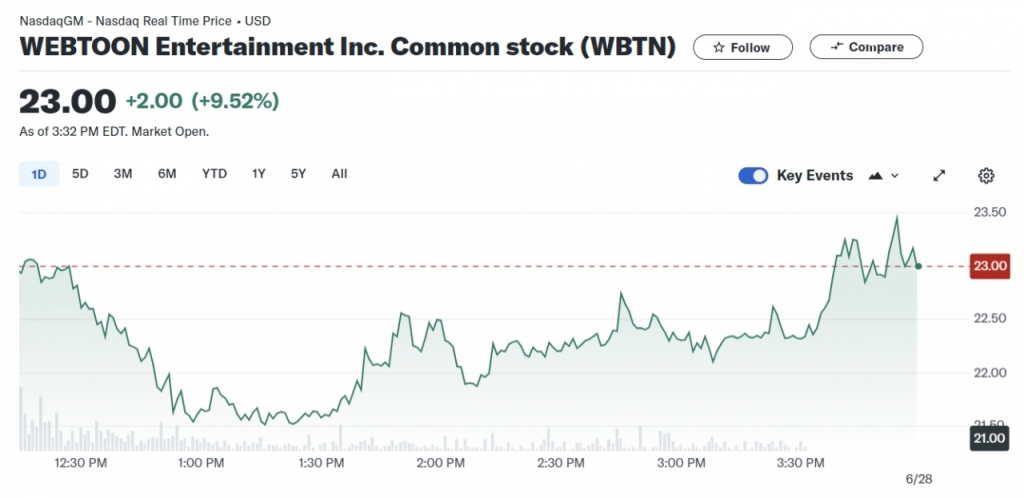 한국 기술기업 네이버가 소유한 만화 플랫폼인 네이버웹툰(법인명 웹툰엔터테인먼트)가 이날 나스닥 시장에 데뷔했다. 온라인 만화 플랫폼인 네이버웹툰은 이날 약 3억 1500만 달러를 조달하면서 IPO(기업공개)에 성공했다. 당초 공모가 범위는 주당 19~21달러로 책정했지만 최종 공모가는 투자자 수요가 몰리면서 최상단인 21달러로 확정됐다. 캘리포니아주 로스앤젤레스에 본사를 둔 이 회사의 가치는 초기 거래에서 26억 7000만 달러로 평가됐고 이날 거래에서는 9.52% 상승한 주당 23달러에 마감됐다.