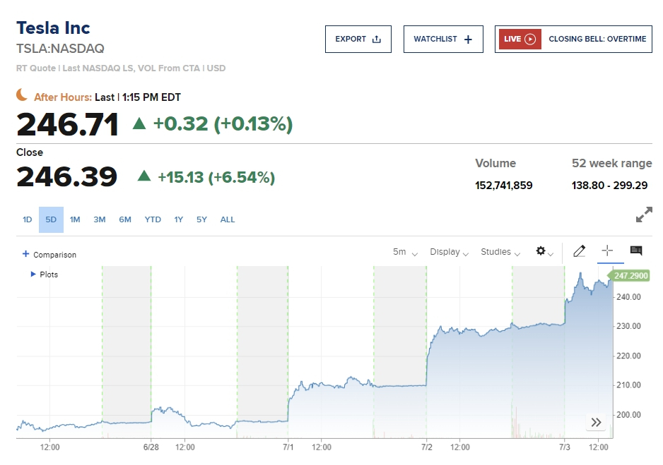 이날 뉴욕증시는 4일 독립기념일(휴장)을 맞아 하루 전부터 오후 1시에 조기 폐장했다. 테슬라가 전일 인도량 증가 보고서에 힘입어 이틀째 급등하며 전 거래일 대비 6.54% 상승했다. 월가 애널리스트들 가운데선 이 전기차 회사가 올해 말에 이전 최고점인 300달러대 주가를 회복하고, 내년에는 400달러대까지 상승할 수 있다는 전망을 내놓은 이도 나타났다.