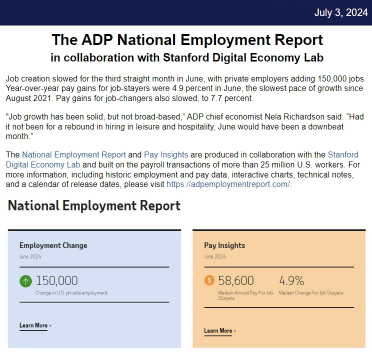 ADP 보고서에 이어 금요일에는 노동부가 비농업 고용 보고서를 내놓는다. 노동부 최신 통계는 5월에 27만 2000개 일자리 증가세로 나타났고, 6월 예상은 20만개로 떨어질 전망이다.