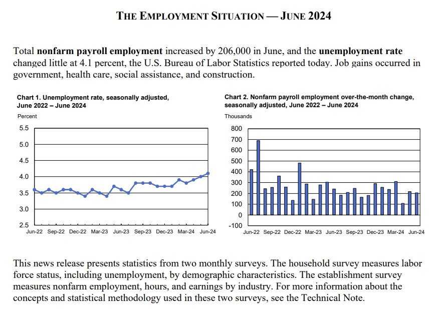 이날 미국 노동부 고용통계국은 6월 비농업 일자리가 20만 6000개 늘어났다고 발표했는데, 이는 다우존스 예상치인 20만명을 다소 상회하는 결과다.