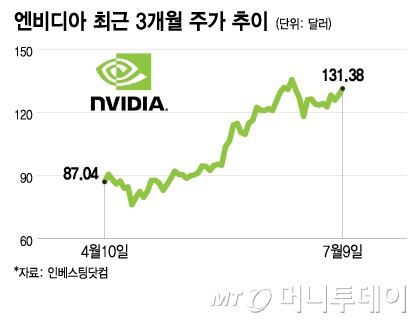 엔비디아 주가는 9일(현지시간) 2.5% 오른 131.38달러로 마감했다. 엔비디아가 종가 130달러를 회복하기는 지난 6월20일 130.78달러 이후 처음이다.