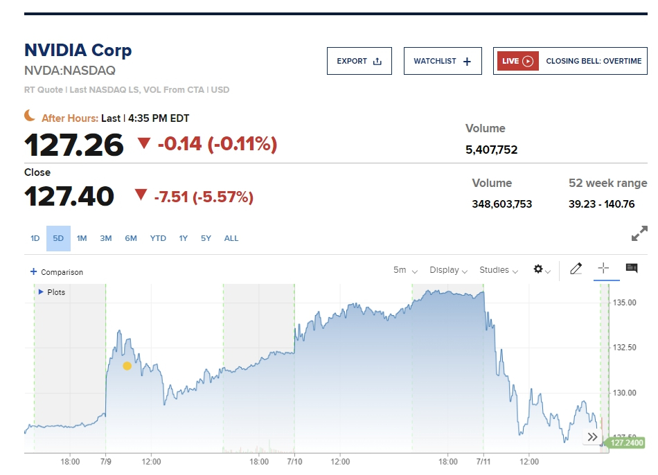 올해 AI(인공지능) 랠리를 이끌었던 엔비디아는 5% 이상 하락하면서 주가가 120달러대로 주저앉았다. 전일까지 다시 130달러대 중반으로 오르면서 전세계 시가총액 1위 탈환을 눈앞에 뒀지만 이날 인플레이션 완화 지표가 나온 것이 오히려 차익실현세를 앞당기고 재상승가도를 주춤하게 만들었다. 시총 3위권 이내의 애플과 마이크로소프트(MS)도 각각 2% 안팎 하락했다.